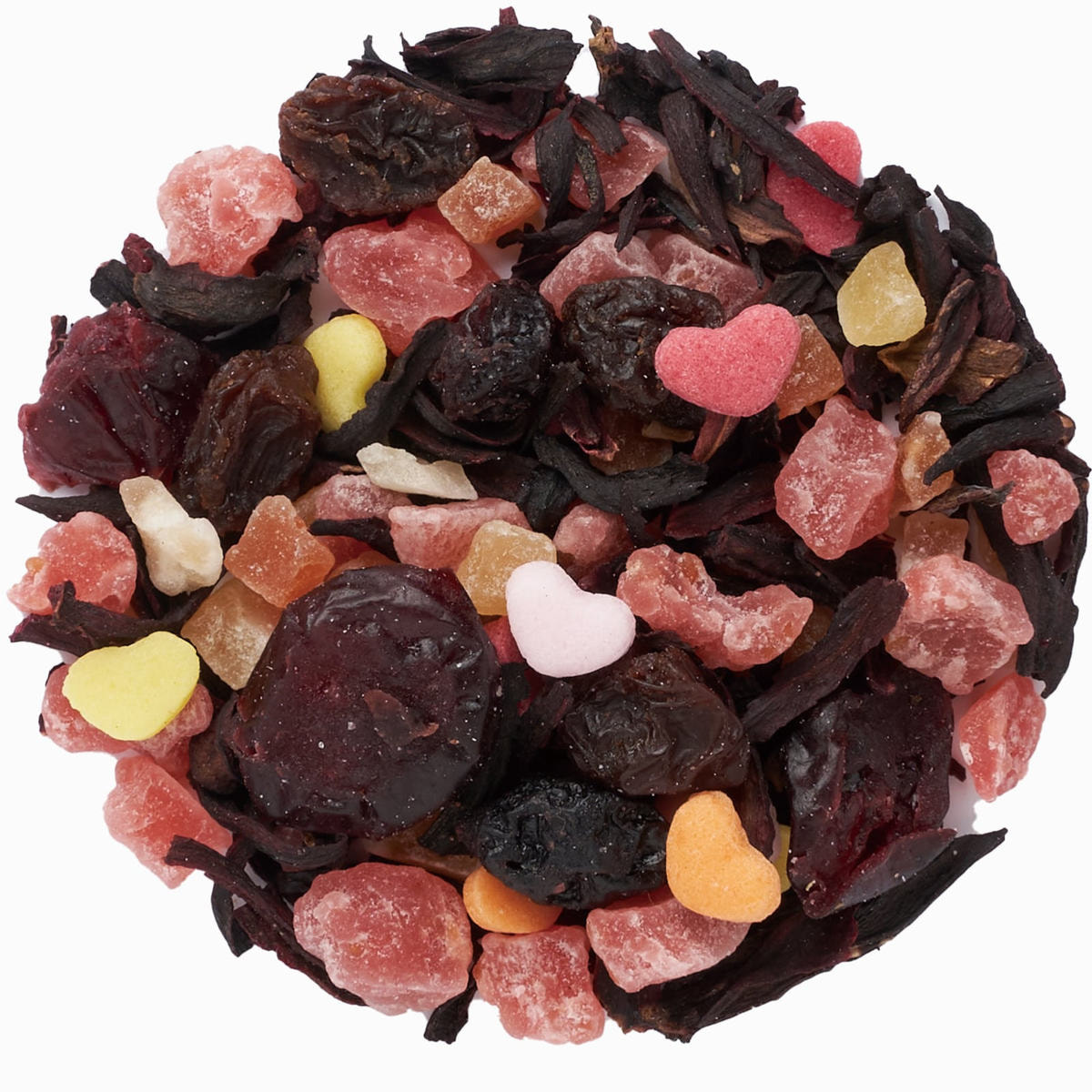 加糖ドライストロベリー(タイ製造)、有機ハイビスカス、加糖ドライパパイヤ、加糖ドライクランベリー、トンプソンレーズン、加糖ドライブルーベリー、砂糖調製品(ゼラチンを含む)/香料、クエン酸、保存料(亜硫酸塩)、増粘剤(CMC)、着色料(赤40、赤102、赤106、黄4、黄5、青1)