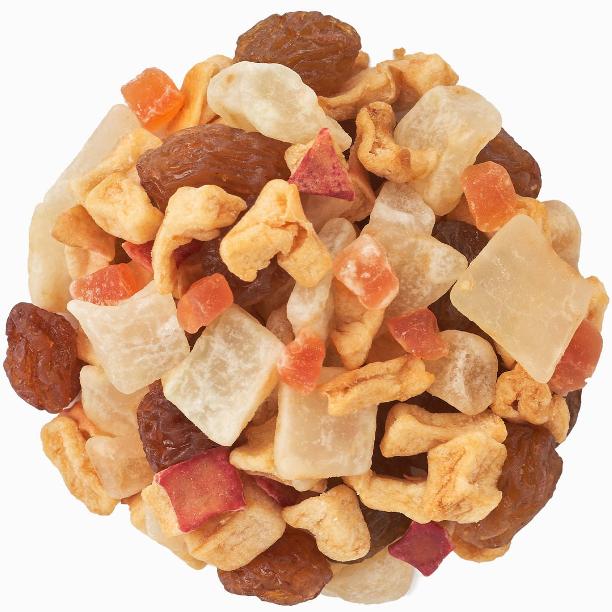 サンマスカットレーズン(オーストラリア製造)、加糖ドライアロエベラ、加糖ドライパパイヤ、加糖ドライアップル、有機ドライアップル/香料、クエン酸、保存料(亜硫酸塩)