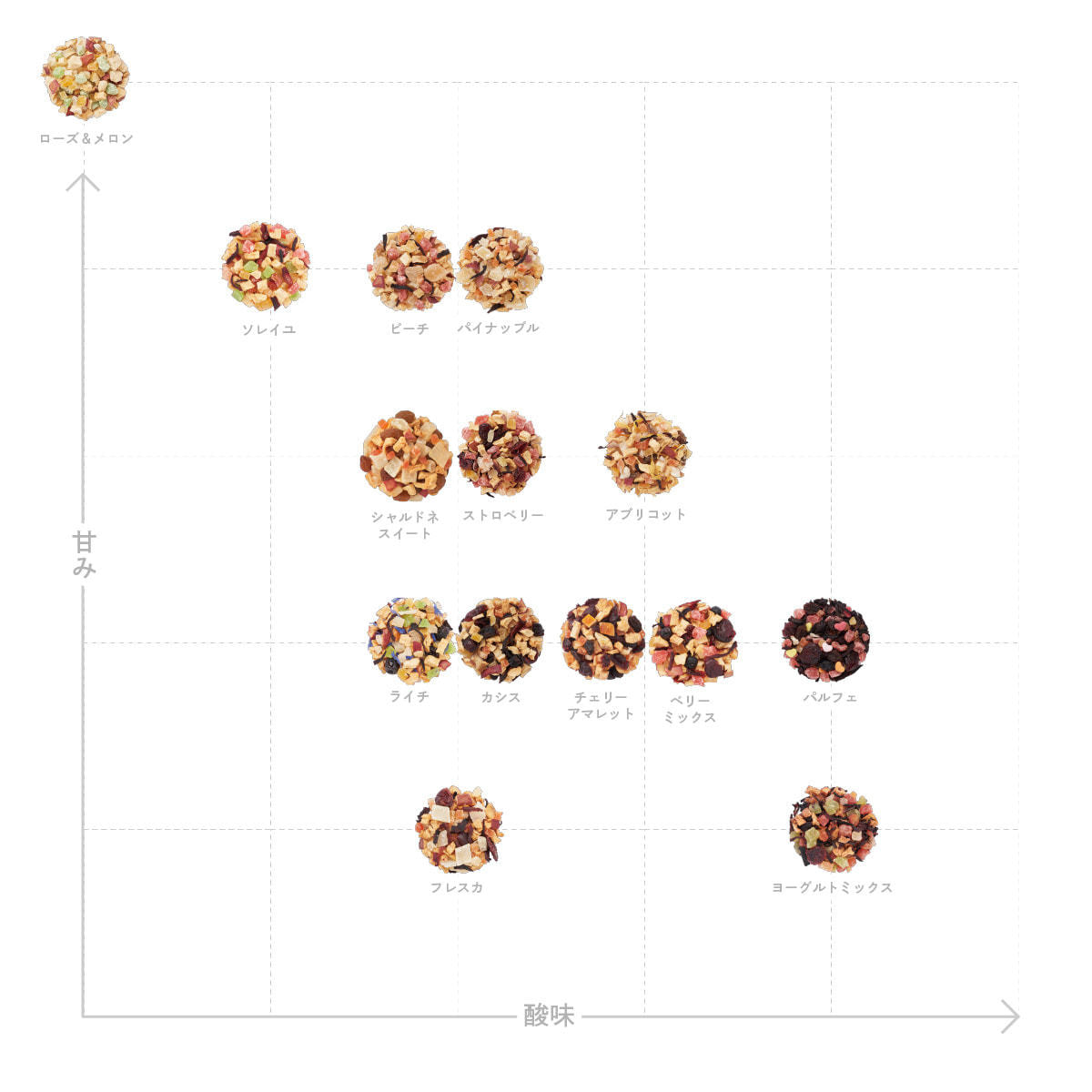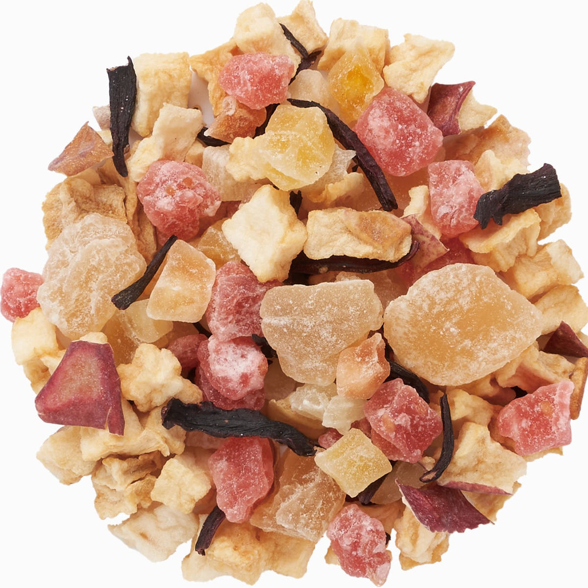 加糖ドライピーチ(タイ製造)、加糖ドライストロベリー、有機ドライアップル、加糖ドライパパイヤ、加糖ドライマンゴー、加糖ドライパイナップル、有機ハイビスカス/香料、クエン酸、保存料(亜硫酸塩)、着色料(赤40)