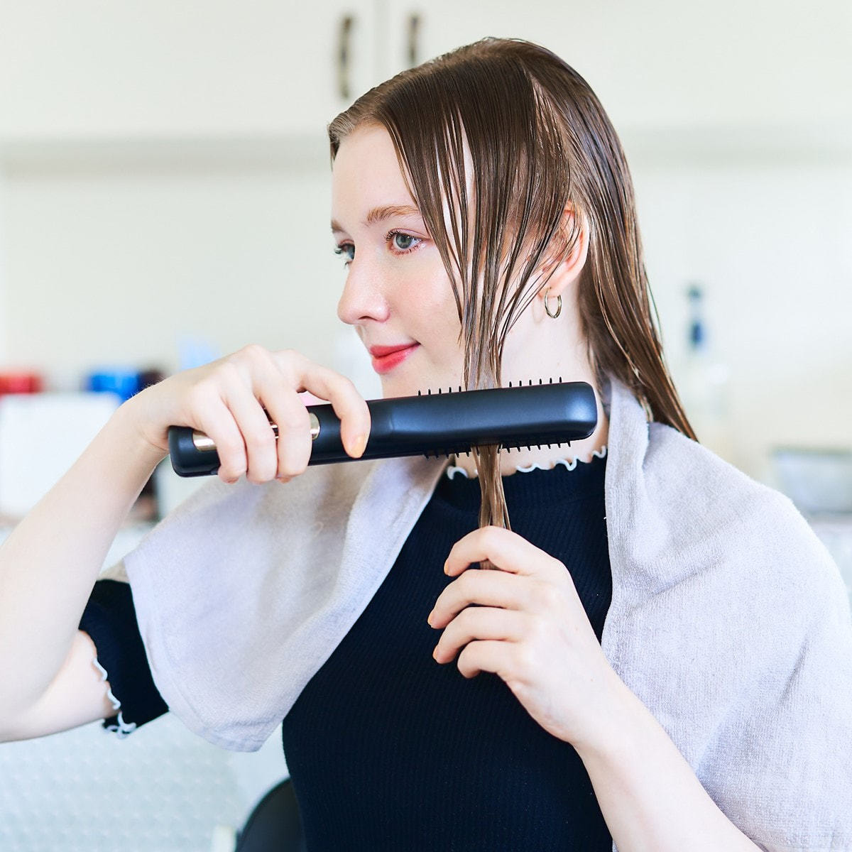 タオルドライ前のぬれた髪に、アウトバストリートメントを塗布してご使用ください。(週に1~2回、約10分)
